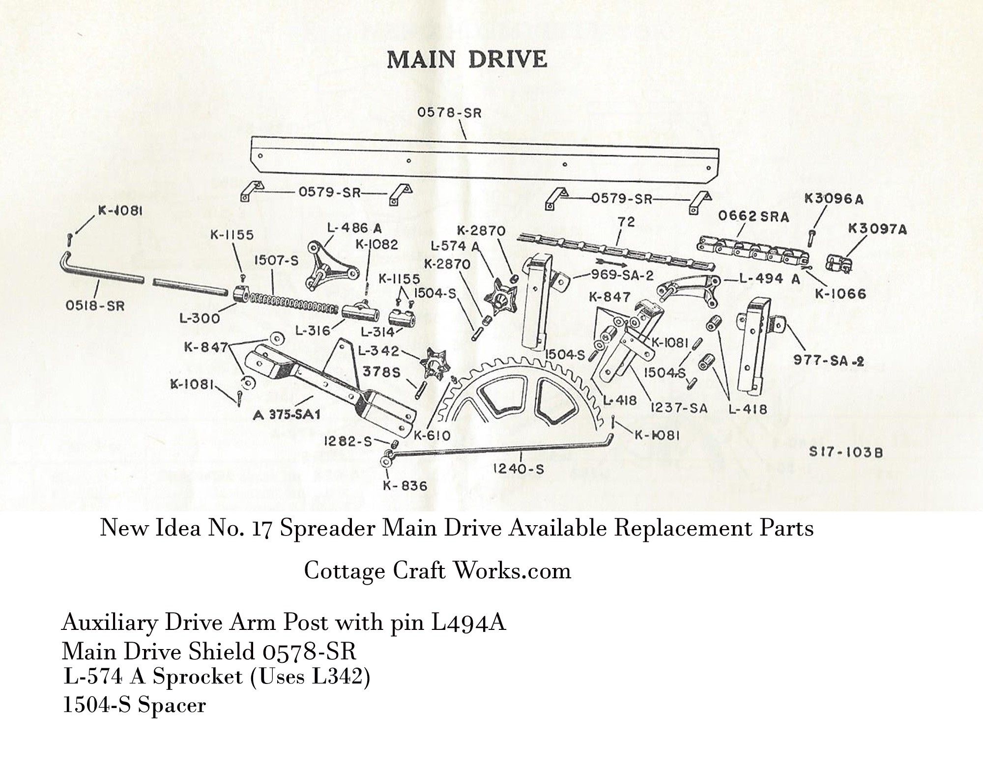 Main Drive replacement parts for vintage New Idea No. 17 Manure Spreaders. Available parts include the Auxiliary Drive Arm Post with pin L494A and the Main Drive Shield 0578-SR.