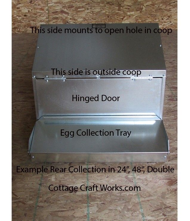 Nest box front collection is 8” tall x 24” wide at the entrance point. The rear collection option using the taller slanted roof is 14” tall. The inside compartment measures 14" tall x 24" wide x 11-1/2” deep. The 24” nest model measures overall 24-1/2” wide x 20” tall x 17” deep.