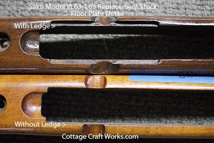 Machine rough inlet walnut replacement stock for the Sako model VL63, L63 lever-action rifle. This rifle was made with two styles of floor plates, one with a ledge and one without. Review the second photo and select the one that matches your gun.